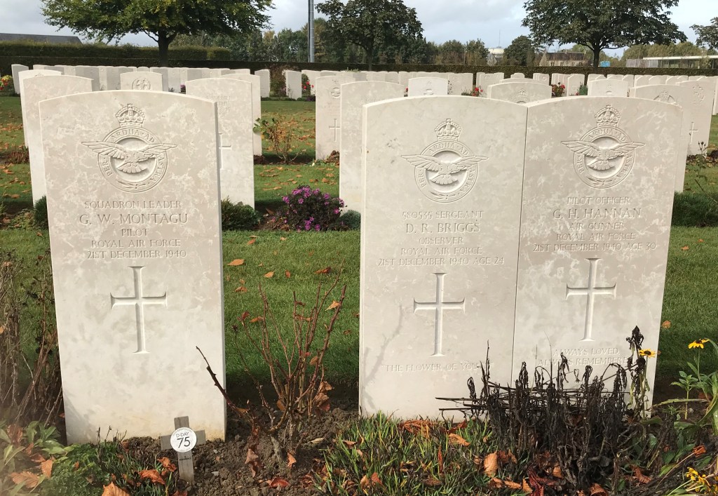 On December 21st, his aircraft, Blenheim IVF R3878, failed to return from a reconnaissance sortie over Brest, with the loss of its three crew: Squadron Leader GW Montagu (pilot), Pilot Officer GH Hannan (gunner) and Sergeant D R Briggs (observer).
