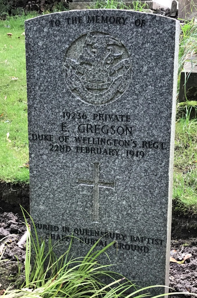 Ernest was buried at QUEENSBURY BAPTIST CHAPEL BURIAL GROUND, following the closure of this cemetery he is now commemorated by special memorial at HALIFAX (STONEY ROYD) CEMETERY.