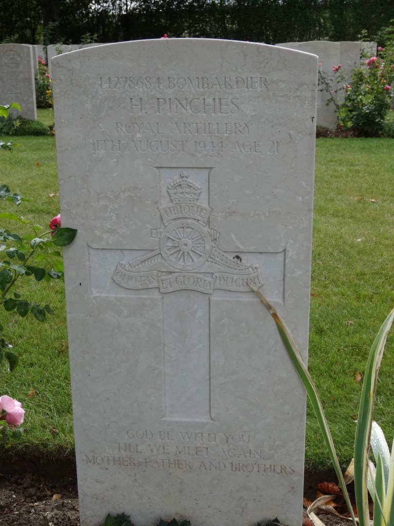 Son of Harold and Emily Pinches, of Queensbury. Harold served in the Royal Artillery as a Bombardier with 21 Anti-Tank Regiment. Harold died on 11th August 1944, aged 21. He is buried at BAYEUX WAR CEMETERY. France.